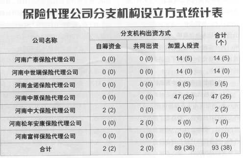 在河南专业保险代理市场上,各公司设立分支机构和服务网点的方式较多,具体做法也因公司而异,但一般都具备三个特点,一是保险代理公司在设立分支机构和服务网点时不投资,只进行相关的指导,开办所需费用全部由加盟人承担;二是为加强管理,保险代理公司一般都对分支机构和服务网点的财务、业务进行集中管理;三是合作双方按分支机构和服务网点的业务所得情况,按比例进行利益分配。
