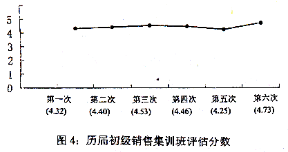 从学员对集训班和集训班续集的评估来看,我们的分数是在曲线上升(如图4、图5)。几乎每次都可以接到学员的感谢信。有些是当面表达出来的,其中一名学员给我留下了深刻的印象。他在一门课的考试中不及格,按照规定,我们又给了他一次机会补考,他通过了。在60多个小时的集训中,他一直比较安静,最后一天他们小组的发言是他做的,结果也不很理想。集训班之后,他过来握住我的手,双眼含着热泪说:“三个月后,我们再见面时,我不会再让你们失望的!”从他的话中,我能感受到集训班给他的冲击和震撼。的确,他在集训班失败过,让他心服口服。但最重要的是,他没有丝毫的放弃,他有足够的勇气和信心调整和改变自己,让我们在三个月后看到他的改变和进步。还有一位学员刚从竞争对手公司出来,加入我们的公司,他说:“这次集训对我帮助太大了。我发现你们真正在为我们着想,想方设法让我们学习。”我们为学员所做的努力能让他们感觉到,这已经让我们很感动了。