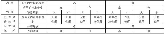 通常,任务的结构化程度越低,越需要外部与用户的高度结合。采用难度大的高技术项目通常借助于高度的内部项目结合和规范化很低的计划和控制。规范化高的计划和控制对技术难度低而规模大的项目最为有用。项目风险的管理对策见表3。