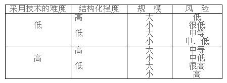 因此,在项目实施管理过程中,随时研究项目的风险并作出相应的对策是管理工作不可映少的。通常影响项目内在风险的因素有三个:项目的规模、业务的结构化程度以及项目的技术难度。把这三种因素的高低(或大小)组合起来,所可能产生的8种项目风险估计见表2。