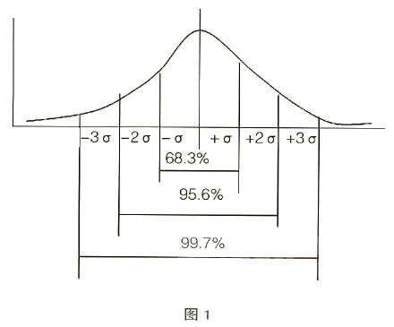 如前所述,真实程度并不直接就是可靠程度,可靠程度除受被测量数值真实程度的影响外,还受可容忍误差大小的影响。根据正态分布计量模型可知,在测量值呈正态分布的情况下,有63.8%的项目值会落在±1个正态标准差之间;有95.6%的项目值会落在±2个正态标准差之间;有99.7%的项目值会落在±3个正态标准差之间,如图1所示: