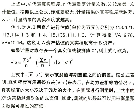 当我们对某一数据的真实程度进行评价时都知道,若多个人对某一对象独立进行计量时,得出的数据越接近,测量结果的可信程度就越高,如多个人对某一项固定资产的价值进行评估,若每个人得出的结论都与该固定资产的账面记录差距较小,说明账面记录较为可靠;若每个人得出的结论都与账面记录有较大差距或相互之间有较大差距,说明账面记录的可靠程度较差。因此,数据的真实程度可用多次独立计量得出的数据和离散程度来衡量。