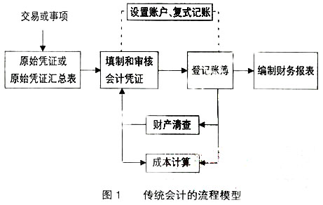 会计核算方法是对经济业务进行完整、连续和系统的记录和计算,为经营管理提供必要的信息所应用的方法。传统会计的核算流程一般包括设置账户、复式记账、填制和审核凭证、登记账簿、成本计算、财产清查和编制财务报表。如图1: