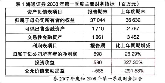 2008年4月10日,海通证券股份有限公司(以下简称“海通证券”)同时发布了2007年度和2008年第一季度财务报告。海通证券2008年第一季度主要财务指标见表1。