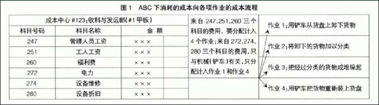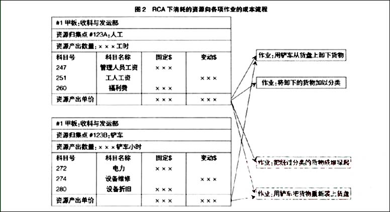 RCA与ABC的基本区别主要体现在成本应用的具体流程上,现以一简例加以说明。在这个例子中,ABC称为“成本中心#123”,从事收料与发运。具体进行四种作业,即:对仓库运来装在“货盘”的货物,第一步是用铲车从货盘上卸下货物;第二步将货物用人工分类;第三步把经过分类的货物成堆垛起;第四步再用铲车把货物装上货盘。在ABC下,把这个成本中心所发生的费用追踪计入这四项作业的过程,可以用图1来表示。图2是在RCA下的成本流程情况。