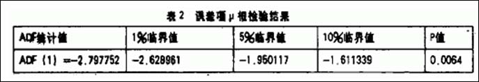 则白噪声误差项μ=㏑HP+0.048339㏑ER-0.003009㏑HM-4.803418