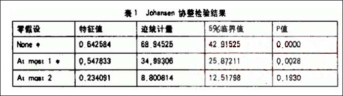 作ADF平稳性单位根检验可知,变量本身并不是平稳的,在经过一阶差分以后变成平稳时间序列。变量同阶平稳通过ADF单位根检验,说明变量之间存在着协整关系,可以进行协整检验。根据AIC和SC值进行判断决定用滞后一阶,即选用VAR(1)模型。本文基于VAR方法的协整系统检验,检验结果如表1: