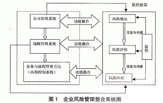 通过长期的工作实践和思考分析,笔者认为:企业的风险管理工作需要和企业管理的多方面相结合,构建整合的企业风险管理系统。这不仅要考虑和内控体系的融合,还必须与企业公司治理、战略管理等系统相整合。企业风险管理整合系统如图1所示: