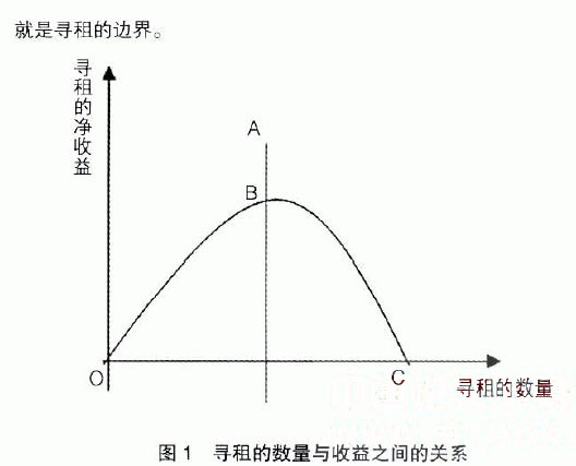 在一定的技术和企业规模下,企业通过寻租所能获得的最大净收益是OB,随着寻租数量的增加,寻租的成本也在不断的增加。寻租者的净收益在不断的减少,当达到B点时,寻租者的收益就变成0,当寻租者的数量继续增加时,寻租的价格不断提高,寻租者将获得负收入。对于理性的投资者而言,曲线BC是一条无效的曲线,而B点就是寻租的最大点。