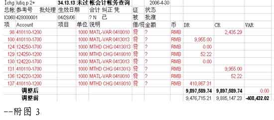 问题的原因查找到了,接下来的工作是如何处理。询问了ERP的实施顾问,她们说以前还未见过这样的情况。于是我们会同IT部在模拟库进行了一系列的测试,做同样的工单,一个输入正确的计量单位,一个输入带“?”的计量单位,再将两个工单产生的财务结果进行比较,然后根据正确财务结果的数据来填写有“?”金额的记账凭证(见附图3),这样,问题就得到了圆满的解决。