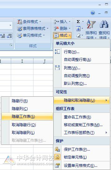 用户可以格局自己的需要设置功能工作表的可见性。选中需要隐藏的工作表,然后切换到【开始】选项卡中,单击【单元格】组中的【格式】按钮,从弹出的下拉列表中选择【隐藏和取消隐藏】→【隐藏工作表】选项,即可将此工作表隐藏。