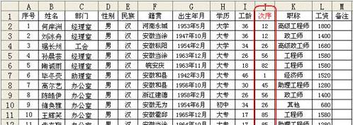 有时,我们对某些数值列(如“工龄、工资”等)进行排序时,不希望打乱表格原有数据的顺序,而只需要得到一个排列名次。对于这个问题,我们可以用函数来实现(以“工龄”为例):在“工龄”右侧插入一个空白列(J列),用于保存次序(图5),然后选中J2单元格,输入公式:=RANK(I2,$I$2:$I$101),然后再次选中J2单元格,将鼠标移至该单元格右下角成“细十字线状”时(这种状态,我们通常称之为“填充柄”状态),按住左键向下拖拉至最后一条数据为止,次序即刻显示出来(图5)。