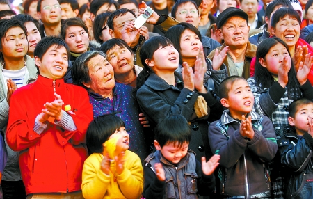 春节期间,在郑州举行的“春满中原”牛年春节商都民俗庙会上,游客观看民间艺人的精彩表演。王 铮 摄