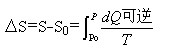 其中P0为起始状态,P为终末状态,S0、S为相对于P0、P状态的熵值,T为绝对温度,Q为热量,S4/-S0叫熵变。若系统经历一个可逆过程,公式中的函数值与积分路径无关,只与系统的初终态有关,所以熵是系统的一个态函数。引入熵概念后,热力学第二定律可表述为:任何系统都存在熵这个态函数,在可逆过程中系统熵的变化等于系统所吸入的热量与热源温度之比,在不可逆过程中,熵变大于热温比。由此可知,系统经历了一个不可逆绝热过程时熵增加,这就是熵增加原理。并有推论:在孤立系统中,不可逆过程熵变大于零;可逆过程熵等于零,不可逆过程都是由非平衡态趋向平衡态的过程,所以平衡态对应高熵态。实际上,熵表现的就是系统内无序态出现的程度。由于热能总是从高能端传向低能端,而在此过程中,系统愈来愈趋向于平衡和无序,所以从根本上讲,熵即系统内无序状态的量度。平衡、无序、熵这三个概念是一致的,平衡态也就是无序态,也就是熵值最大的状态。