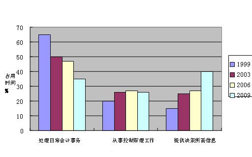 IBM公司2006年在全球范围内对各地分公司任CFO之职的900位高级经理做了一次调查。调查结果表明,从1999年到预计的2009年这10年中, CFO需要在处理日常事务——即料理账务和报表中花费的时间正急剧减少:从1999年的65%减少到2006年的48%,预计2009年将进一步减少到35%;从事控制管理工作所花费的时间从20%提高到26%-27%;而向领导者提供决策所需信息花费的时间已有大幅度的增加,从1999年的15%提高到2006年的27%,预计2009年将进一步提高到40%!详见图1.