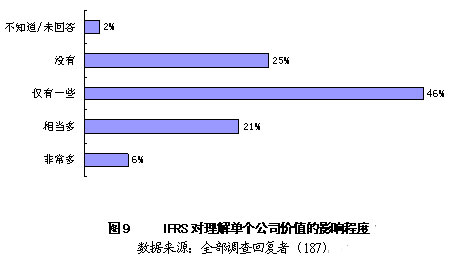 在全面采用IFRS之前,IFRS已经影响了对基金管理者关于价值的理解。几乎3/4的被调查者认为,向IFRS的转变至少对他们所投资公司价值的理解产生一些影响,这主要是因为财务信息更加容易比较且具有更大的透明度(见图9)。2/3的基金管理者也持类似理由,他们表示IFRS影响其对行业部门的估值。