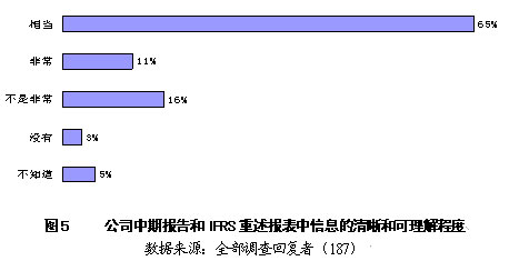 IFRS财务报告更加透明。大多数基金管理者认为,公司2005年报告的IFRS信息相当清晰易懂。65%和11%的基金管理者分别表示IFRS信息是相当和非常清晰的(见图5)。然而,调查结果也表明,公司存在相当大的改进IFRS财务报告空间。