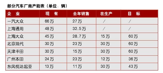 记者从某汽车咨询公司了解到,目前国内汽车行业产能分布不均,2/3的产能集中在排量1.6L以下车型,1.8L以下的车型更占到80%.除了主流汽车厂家外,其他汽车家,特别是各地方小厂的产能利用率严重不足,有的汽车厂年产销才上万台。