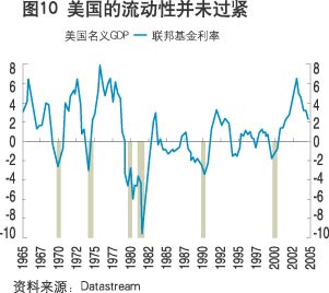我们在这里使用名义GDP减去名义基准利率来衡量流动性的松紧。图10中的曲线描述了过去40年美国流动性的变化,阴影部分代表经济衰退的年份。当曲线为正值的时候,美国联邦基金利率低于名义GDP的增长,因此流动性充沛;反之表示流动性紧张。从图中可以看出,每当美国流动性收缩过紧的时候,如1970年、1975年、1980年~1982年、1990年和2000年,经济衰退随之而来。 虽然1995年的升息并未带来衰退,但是却导致了墨西哥金融危机。
