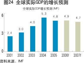 全球经济在2004年和2005年分别高速增长5.3%和4.8%.IMF估计全球经济在今明两年会分别增长4.9%和4.7%.在今年一季度,全球经济增长了5.1%.
