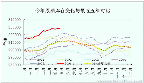 随后,国际油价走势受到库存和中东、非洲主产油国紧张局势的双重影响,期价基本保持在每桶60~64美元的窄幅区间内波动,在震荡中寻找运行方向。3月28日,由于担心来自尼日利亚和伊朗的供应可能中断,导致NYMEX 5月原油期货大涨3%,结算价报每桶66.07美元,创八周以来最高。同时也成功突破了之前的震荡区间。4月,由于伊朗拒绝了联合国安理会令其停止铀浓缩活动的要求,市场开始担忧石油供给前景,油价于是继续攀升。随着伊朗和西方国家围绕核问题的口水战不断升级,以及尼日利亚政府对动荡局势的控制不力,令市场对供给中断的疑虑不断上升。而以美国汽油库存为首的主要油品库存持续下滑,也是刺激油价走强的重要因素。纽约商品交易所(NYMEX)6月原油期价曾触及每桶75.35美元的历史高点。进入5月份,虽然价格有所回落,但仍徘徊在每桶70美元的历史最高水平附近。