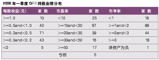 2006年一季度,QFII持有的169家公司中有131家市盈率低于30倍,其中有25家公司市盈率低于10倍,持股平均流通市值在30亿元左右。