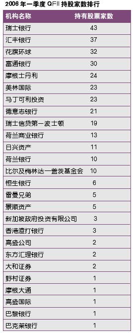 截至2006年一季度,已有26家QFII选择投资了169只A股,一季度,QFII持股市值增长近百亿元,涨幅超过70%,成为当季度内增仓幅度最大和增仓金额最大的投资群体。其中,瑞士银行以43家的持股名列首位,汇丰银行、花旗环球、富通银行紧随其后。