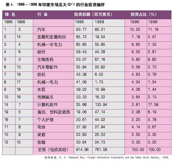 从1996年~1998年的三年间,QFII大举投资印度当时最具潜力的优势行业——软件行业。1996年,投资规模还排名第14位,到了1998年已经上升到了第一位,行业投资比重达到了17.59%。同时,生物医药以及食品饮料和个人护理两大快速消费品行业也得到了QFII的青睐,投资规模迅速扩大,比重上升幅度很大。