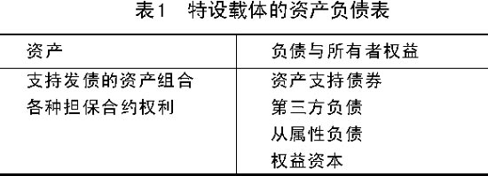 SPV是指购买发起人的基础资产,并依此为基础设计、发行资产支持证券的机构。SPV的发行收入构成向发起人购买标的资产的资金来源。在资产证券化融资结构中,SPV是核心,此外破产隔离和表外融资等证券化的优势只有通过特设载体才得以实现。因此特设载体的设立和运行必须严格符合法律程式和规范。特设载体是为了资产证券化融资设立的法律意义上的经济实体,他不需要场地和职工,是典型的空壳公司。特设载体的资产管理和运营全部委托服务人进行。他不能从事资产证券化交易以外的任何经营业务和投融资活动,它的资产都必须交由信托机构托管。信托机构严格按照信托合同进行账户管理和资金运动。特设载体的资产负债表如表1所示。