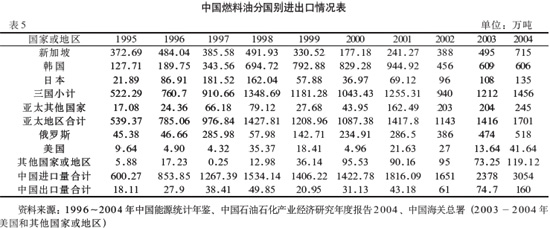 从进口来源地看,主要来自周边国家和地区,其中80%以上的进口来自韩国、新加坡和俄罗斯。近几年韩国取代新加坡成为我国燃料油进口的最大来源国;俄罗斯燃料油由于质优价廉,进口量也在不断攀升。2003年从韩国进口燃料油609万吨,来自俄罗斯的进口比2001年上升了188万吨,达到474万吨。与此同时,与上世纪90年代中期相比,一直作为我国燃料油主要供应来源的新加坡进口数量有所减少,所占比例由1995年的62.1%最低时下降到2000年的12.4%,只是在最近几年略有恢复。2003年从新加坡进口了495万吨。