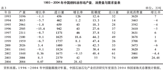 目前,我国燃料油主要由中国石化和中国石油两大集团公司生产,中国石化生产的燃料油主要用于化肥原料和燃料,中国石油投放市场的非自用燃料油高于中国石化,少量国内燃料油的供应来自地方炼厂。从表3来看,90年代以来国内燃料油产量不断下降,2000年以来产量开始上升,这与近几年国内经济高速增长是密切相关的。2004年全国燃料油产量已达到2084万吨。