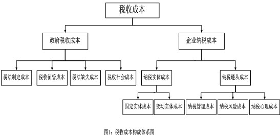 从经济角度分析,税收成本可定义为“在现存经济条件和体制下,国家(政府)实施税收分配全过程所发生的一切有形和无形的耗费。”根据此观点,税收成本包括税务机关的征税成本与纳税人的纳税成本。税务部门的征税成本是税务设计成本,包括税法、政策研究设计和宣传等为一定时期税收收入的组织入库所支出的全部费用;纳税成本是纳税人为缴纳一定时期的应缴税款而支出的全部费用。