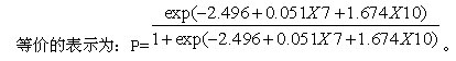 从表中可以看出,X7和X10变量的显著水平均小于0.05,说明预测能力较强,现构建Logistic回归模型,其方程表示为: Logit(Y)=Ln(P/1-P)=-2.496 + 0.051X7+1.674X10.