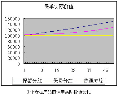 由下图可以看出3个寿险产品的保单实际价值变化情况:保额分红、保费分红和普通寿险3种终身寿险在短期内,如10年,保单实际价值差不多;但是随着时间的增加,3者相差会越来越大。