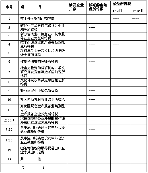 1、“减免所得税”1-9月数填报第三季度《企业所得税纳税申报表》主表第38行次数据;1-12月数填写预计全年减免税额。