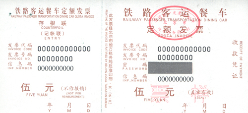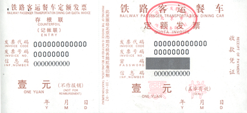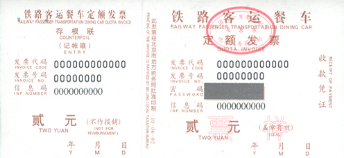 2、《铁路客运餐车定额发票》票样