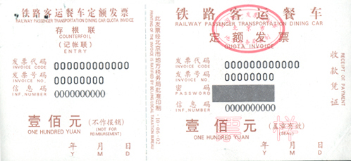 二、《铁路餐车发票》适用于北京铁路局本市所属单位在铁路客运列车上提供餐饮、小商品及其他服务收取款项时开具,同时加盖单位财务印章或者发票使用章,并按收取款项的日期如实填开发票开具日期。
