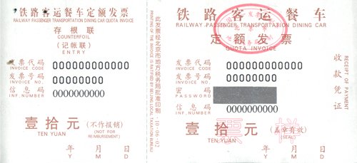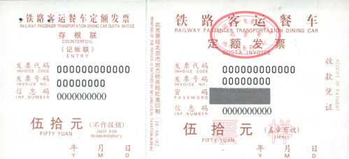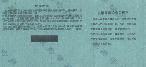 三、《铁路餐车发票》式样及规格按照国家税务总局的有关规定执行,由北京市地方税务局负责印制及发售。查询发票真伪、违规举报投诉可依照发票背面说明进行相关操作。