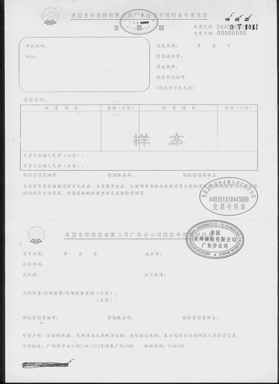 附件:美国友邦保险有限公司广东分公司保险业专用发票式样