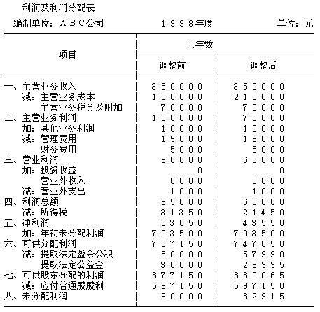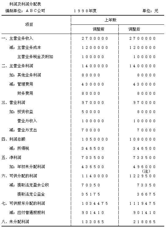 ABC公司1998年度资产负债表的年初数和利润及利润分配表的上年数栏分别按调整前和调整后的金额列示如下,1998年度资产负债表的期末数栏和利润及利润分配表的本年累计数栏的年初未分配利润,应按调整后的年初数为基础编制: