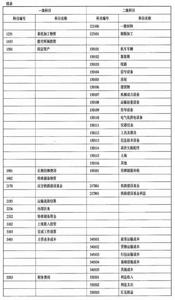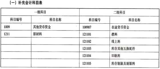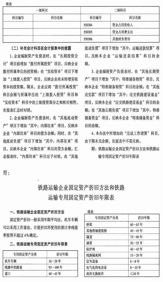 (一)会计科目的设置本办法在《企业会计制度》的基础上增设“拨付所属投资”、“特准储备物资”、“应交铁路建设基金”、“运输进款结算”、“内部往来”、“特准储备资金”、“上级拨入投资”和“完成工作清算”科目,并对“其他货币资金”、“原材料”、“委托加工物资”、“固定资产”、“长期待摊费用”、“主营业务收入”、“主营业务成本”、“管理费用”、“财务费用”、“营业外支出”等科目的明细科目设置和核算内容进行了补充规定。
