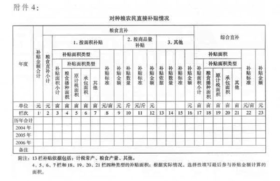 (六)综合直补,由于2004年和2005年没有综合直补,故表格内2004年、2005年综合直补相关单元格不允许录入数据。综合直补的补贴面积类型中,按粮食直补面积兑现综合直补资金的,在“其他”栏填报;补贴面积类型中的承包面积指二轮土地承包面积。