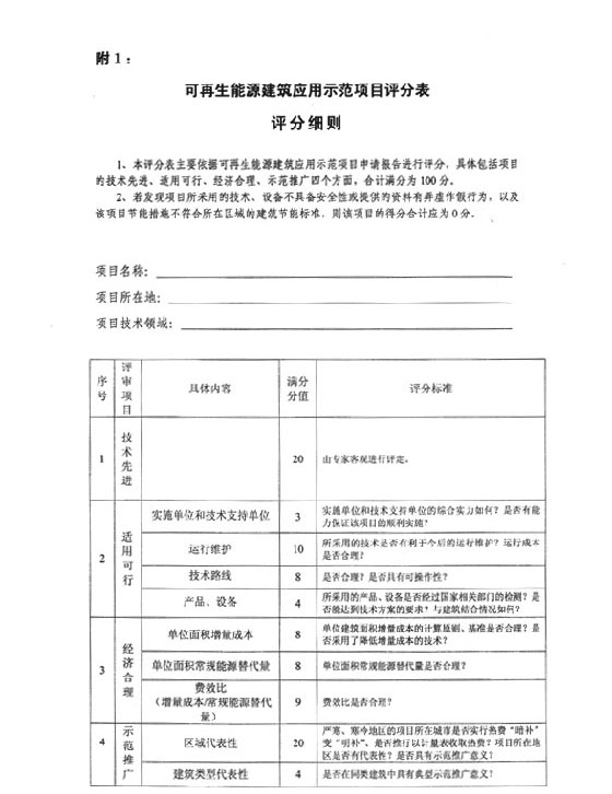 项目主要依据可再生能源建筑应用示范项目申请报告进行评分,详见《可再生能源建筑应用示范项目评分表》(附1),评审内容如下: