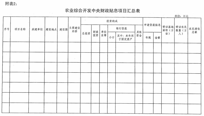 第十三条 省级财政部门、农发机构在规定的贴息额度范围内对符合要求的贴息项目进行汇总,填列《农业综合开发中央财政贴息项目汇总表》(附表2),连同项目单位的申报材料一并上报国家农业综合开发办公室(以下简称“国家农发办”)审定。