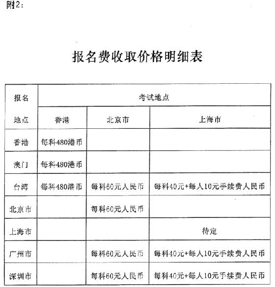 3.报名费用(参见附2):在北京参加考试的考生每科报名费60元人民币,在上海参加考试的考生每人10元人民币手续费及每科报名费40元人民币。