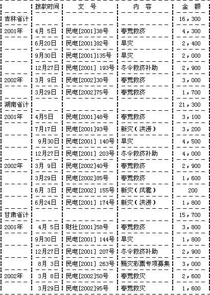 检查中如遇特殊情况和问题,请及时与我部监督检查局和社会保障司联系,联系电话:监督检查局(010)68552318、68552317,社会保障司(010)68551245、68551295.附件1:2001~2002年6月特大自然灾害救灾补助资金拨款情况统计表
