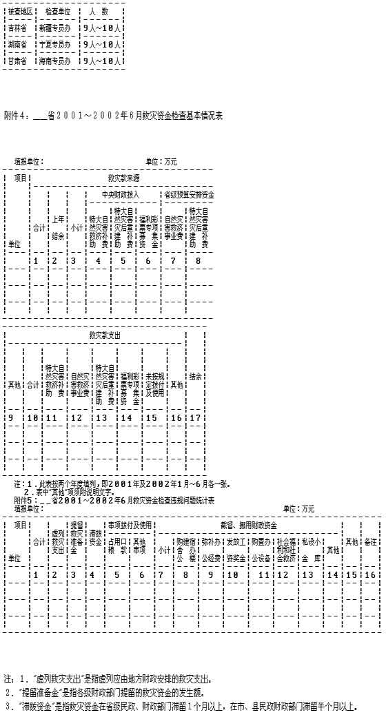 一、检查范围。本次检查的范围主要是对2001年至2002年6月吉林、湖南和甘肃三省中央和地方安排的救灾资金、1998年至2002年6月安排的中央级救灾储备物资的情况进行重点检查,对检查中发现的重大问题可以追溯到以前年度或延伸到有关单位。救灾资金检查面要不低于救灾补助资金总量的70%,以此确定对各市(地)县检查的户数,并要按照资金的走向抽查部分受灾户。