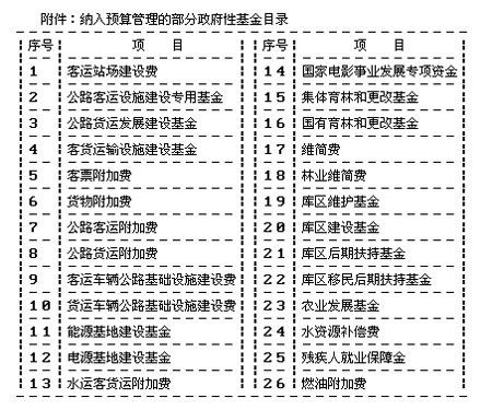 根据《财政部关于公布保留的政府性基金项目的通知》(财综〔2002〕33号,以下简称《通知》)精神,决定自2002年7月1日起,将部分尚未纳入预算管理的政府性基金(具体目录见附件)纳入预算管理。现将有关预算管理事宜明确如下: