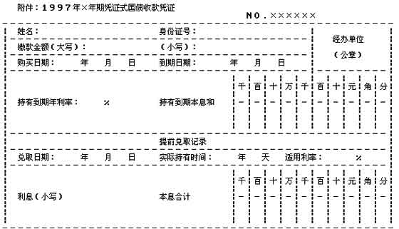 2.凭证式国债采取填制“1997年×年期凭证式国债收款凭证”(以下简称“收款凭证”,格式附后)的方式发行,收款凭证一式三联,由各省、自治区、直辖市、计划单列市国债办组织印制。开具“收款凭证”时,除注明投资者身份证件号码外,还应明确注明期限、到期利率等内容。严禁使用“国债代保管单”销售凭证式国债。