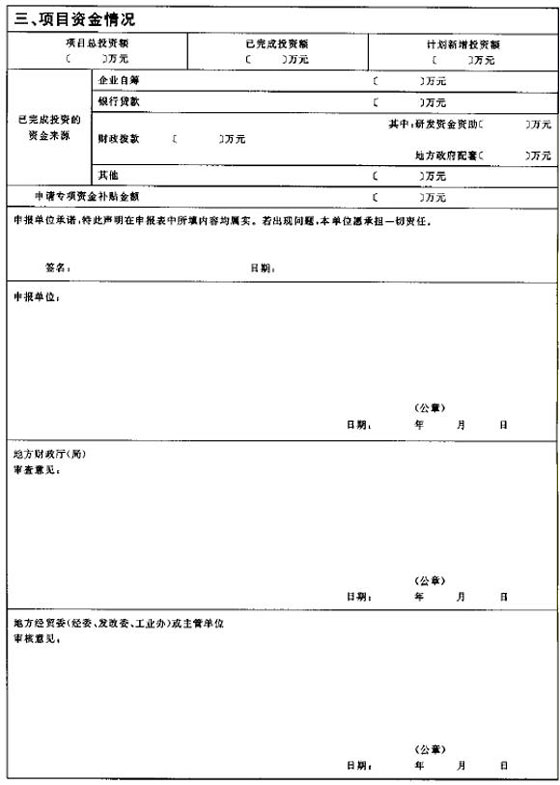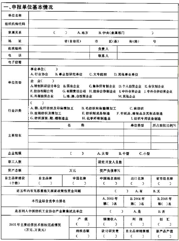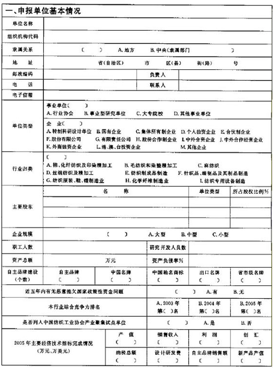 1.《纺织行业加快结构调整转变增长方式专项资金项目申报表》:为申报单位申请纺织行业结构调整转变增长方式专项资金项目的重要文件。申报表一律用A4纸打印,按要求签字盖章后,与附加材料一起报送各省、市纺织行业主管部门,同时报送电子文本。